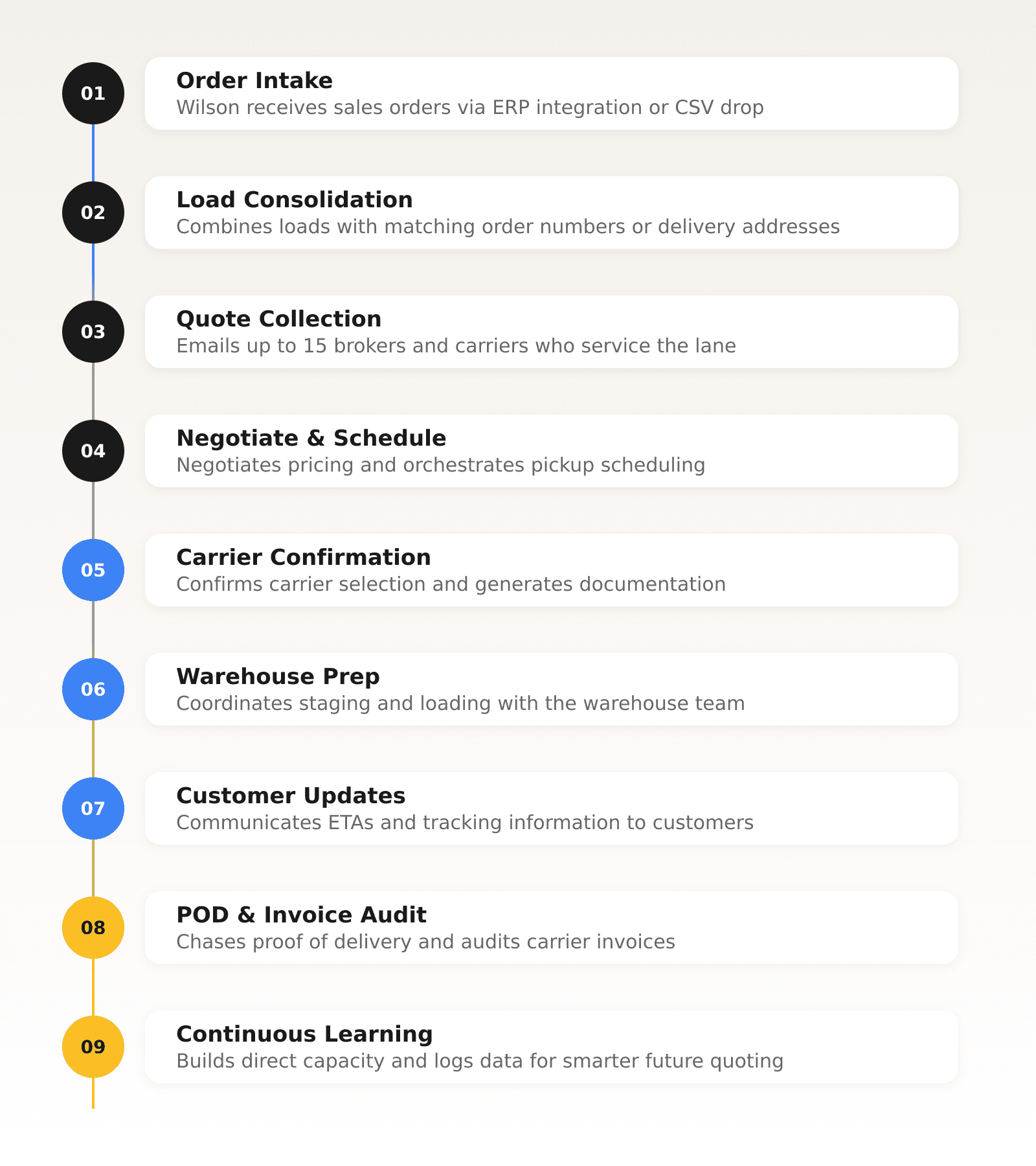 To keep up without expanding their back office, Musser brought on Wilson, Cartage’s AI logistics coordinator, to live inside their existing email and CSV workflow and turn raw order data into covered loads—so the team can stay focused on production and quality.